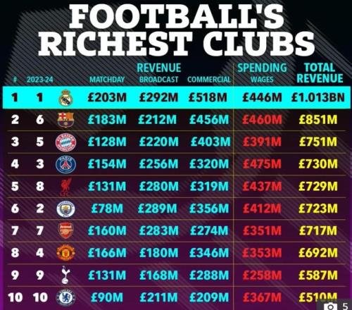 对于曼彻斯特的另一支球队来说,这也是一个糟糕的结果,曼城的营收为7.23亿英镑,比之前的数字下降了1%,从2023年的榜首、去年的第二名跌至第六名。